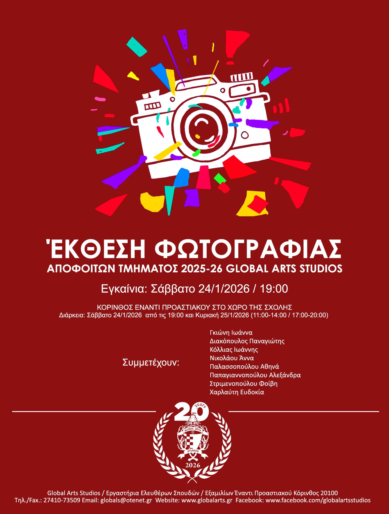 Σας προσκαλούμε με ιδιαίτερη χαρά στην ΈΚΘΕΣΗ ΦΩΤΟΓΡΑΦΙΑΣ των αποφοίτων του τμήματος ακαδημαϊκού έτους 2025-26 Α΄ κύκλος των GLOBAL ARTS STUDIOS.
